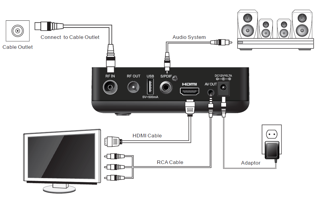 Чтобы подключить новый телевизор, потребуются как минимум 2 розетки – для тюнера и адаптера питания. Подключите антенный кабель и включите в розетку штекеры. С тыльной стороны необходимо закрепить тюнер и адаптер питания.