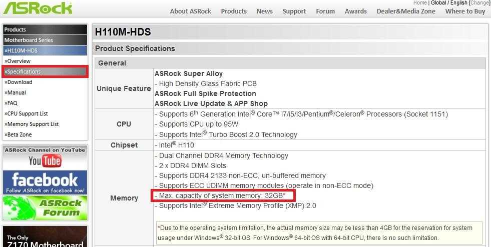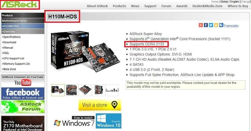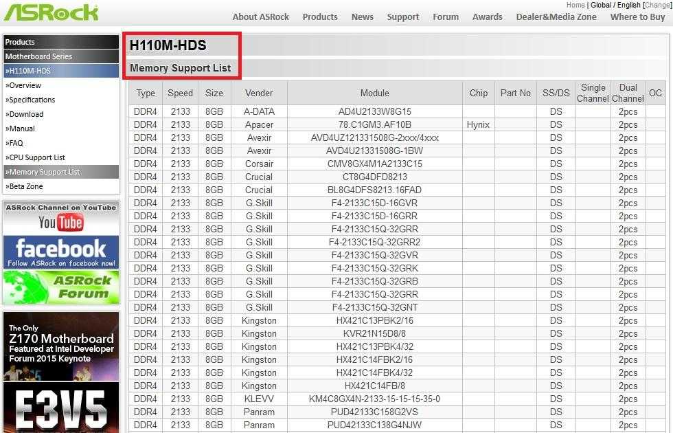 Чтобы подобрать оперативку для такой конфигурации, нужно перейти на официальную страницу материнской платы ASRock H110M-HDS — www.asrock.com/mb/Intel/H110M-HDS.