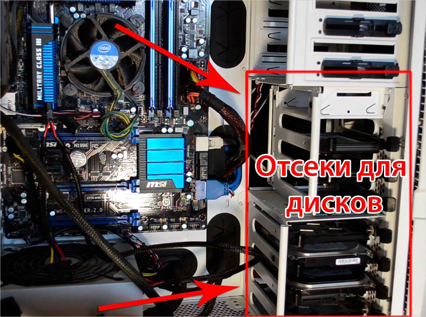 Отсеки для подключения жестких дисков расположены в правом нижем углу. Сейчас у вас там уже стоит как минимум один диск. Второй мы установим рядом.