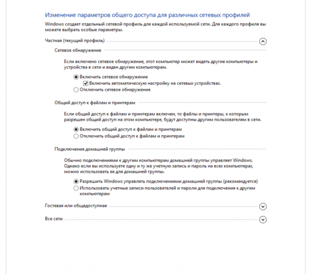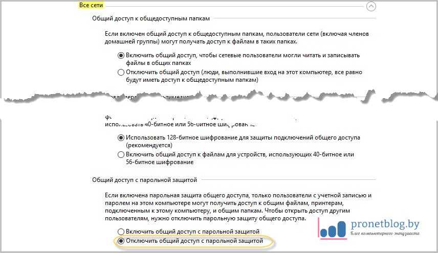 После этого обязательно выбираем профиль «Все сети» и активируем строку «Отключить общий доступ с парольной защитой»: