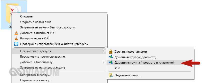 Первый способ – это добавить нужную папку в любую из стандартных библиотек Windows, кликнув по ней ПКМ и выбрав в меню соответствующую опцию. Второй способ столь же прост. Кликаем по расшариваемому каталогу ПКМ, выбираем опцию «Предоставить доступ – Домашняя группа (просмотр и изменение)