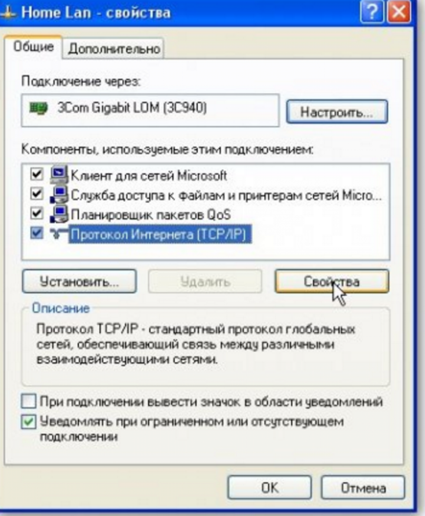 - выбрать «Протокол интернета» и нажать «Свойства»;