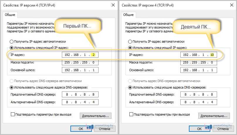 Помним, что в нашей сети числятся аж девять машин. Будет логичным, если назначать им IP-адреса по возрастанию. То есть в настройках сетевых карт первого и последнего компов будут вписаны следующие значения: