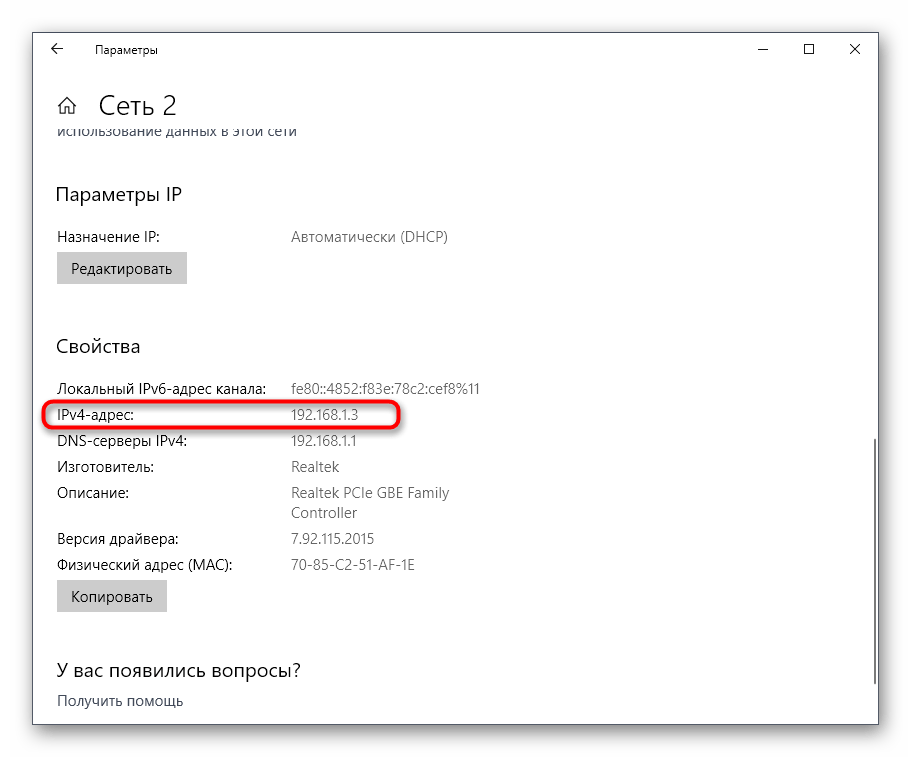 Отыщите параметр «IPv4-адрес». Увиденный адрес и является необходимым.
