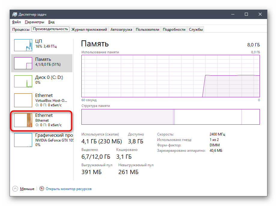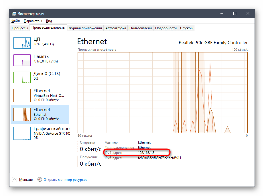 2. Перейдите во вкладку «Производительность» и в ней нажмите на пункт «Ethernet». В нижнем правом углу будет показан айпи.