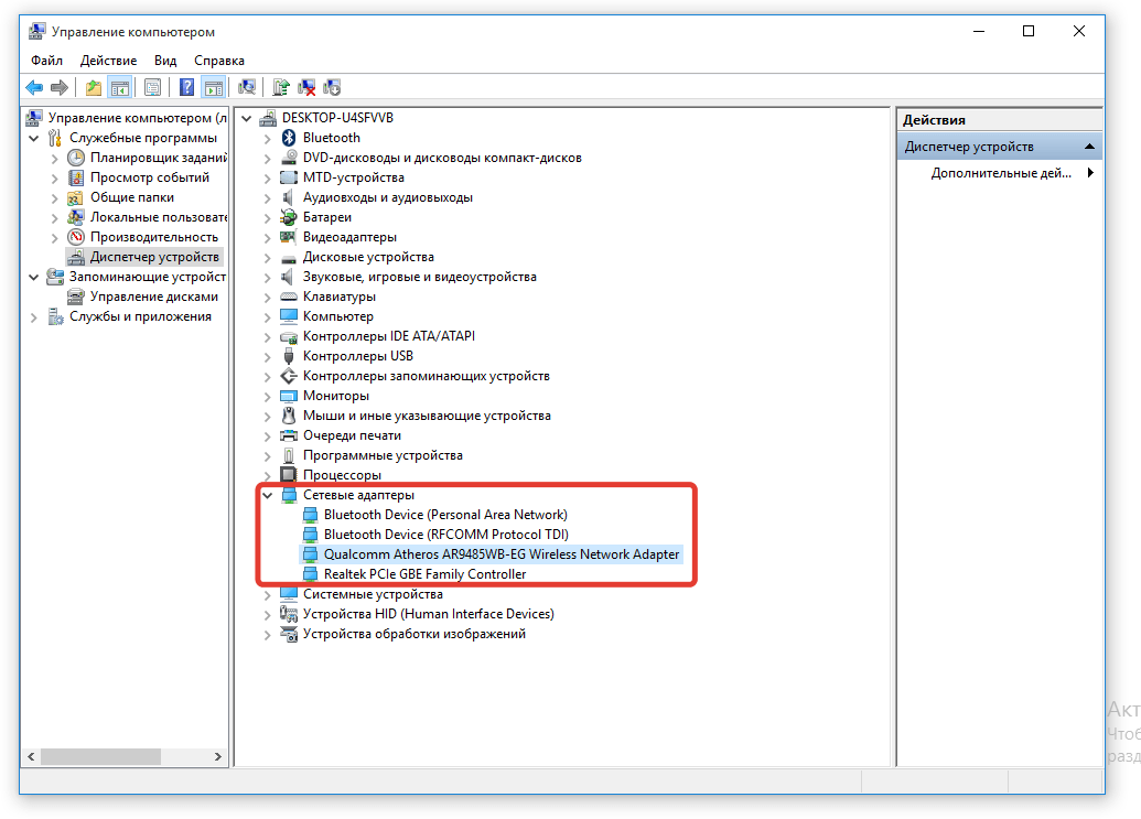 - В диспетчере устройств перейти в раздел «Сетевые адаптеры». Если в списке устройств есть название Wireless, то в технику встроен модуль соединения WiFi.