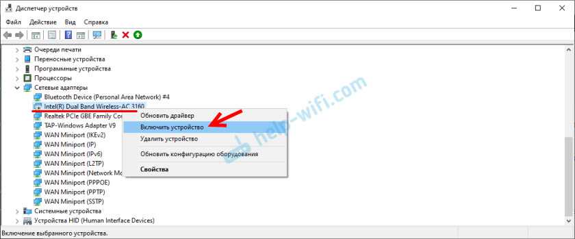 В разделе «Сетевые адаптеры» ищем устройство, в названии которого есть Wireless или Wi-Fi. Кликаем по нему правой кнопкой мыши и выбираем пункт меню «Задействовать». Если вдруг устройство откажется запускаться и будет выдаваться ошибка — пробуйте скачать драйвера для адаптера с официальной странички производителя и установить их.