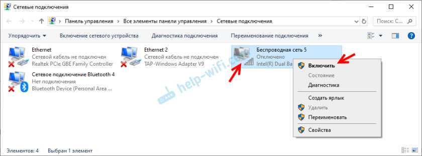 Если возле подключения «Беспроводное сетевое соединение» написано «Отключено», то нажмите на него правой кнопкой мыши, и выберите Включить.