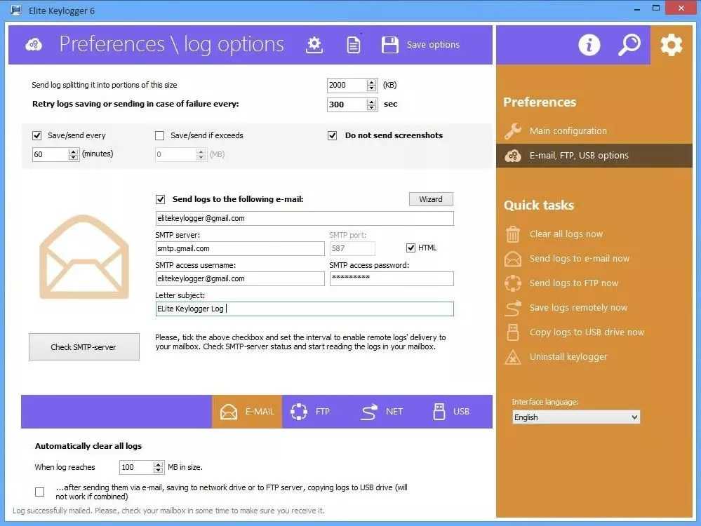 Полученные сведения могут храниться на жестком диске компьютера, быть отправленными на электронную почту или по FTP, пересланы по и даже скрытно скопированы на подключенный или . Размер логов не ограничен.