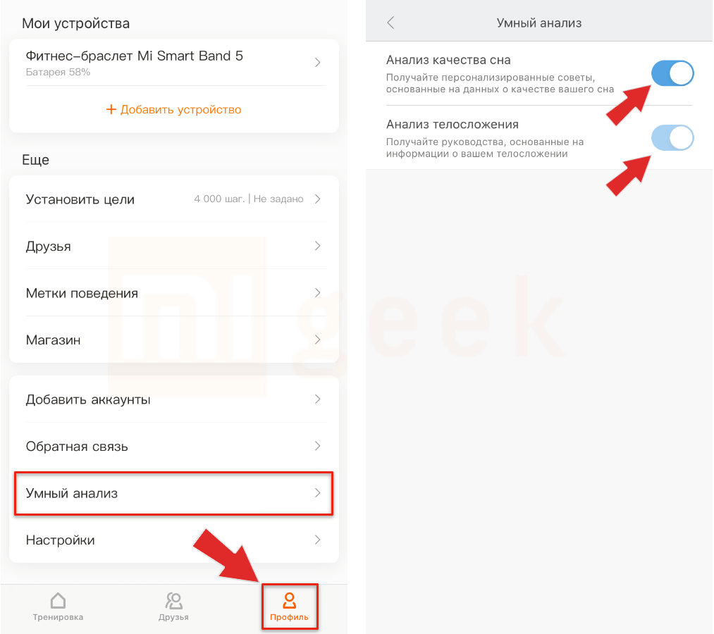 Теперь выходим из настроек браслета и переходим во вкладку «Профиль» в Mi Fit. Открываем «Умный анализ» и активируем все опции.