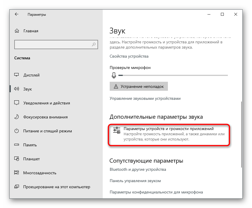 В блоке «Дополнительные параметры звука» выберите пункт «Параметры устройств и громкости приложений», если хотите настроить громкость каждой программы отдельно.