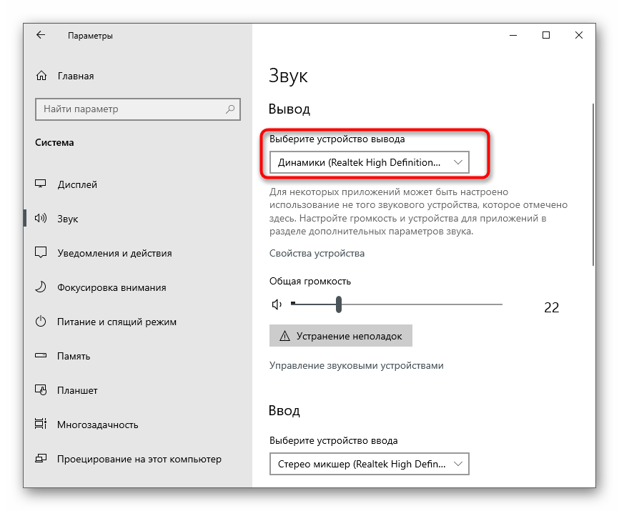 Убедитесь в том, что собираетесь регулировать громкость для подходящего устройства вывода. Если нет, измените его через выпадающий список.