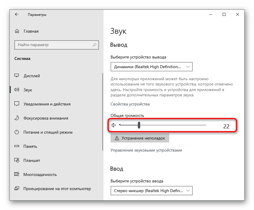 Самый простой вариант — вызвать общий регулятор громкости и перетянуть ползунок, подгоняя ее до требуемого уровня. Появляется он после клика по значку с динамиком на панели задач, который отображается там всегда или показывается при открытии всех добавленных значков.