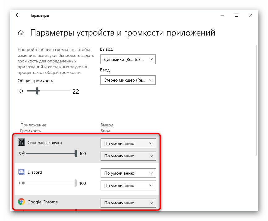 В новом окне отыщите ползунки, относящиеся к запущенным на текущий момент приложениям, и измените их положение, если это требуется.