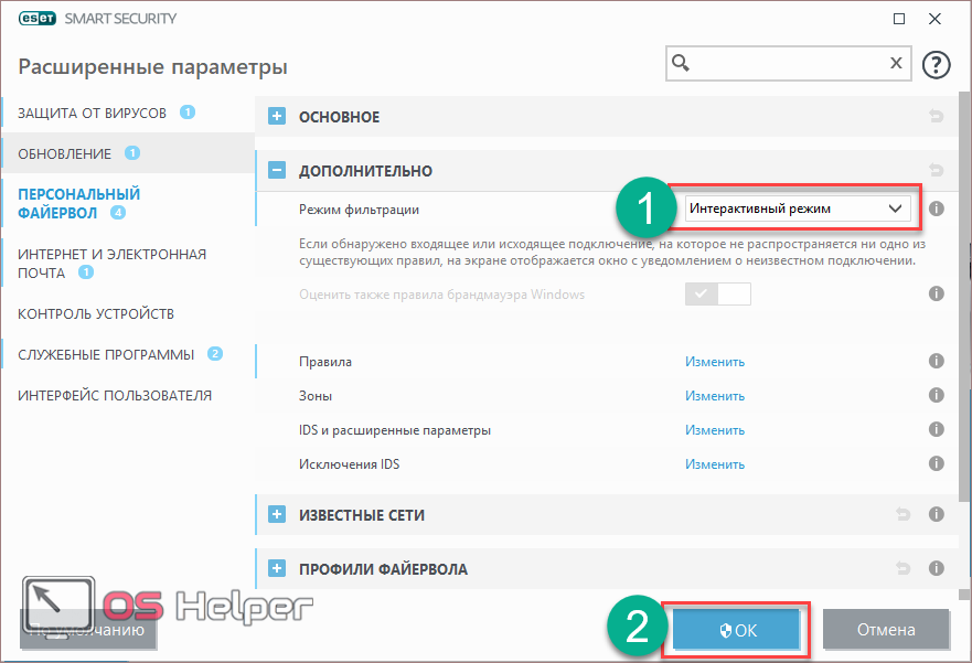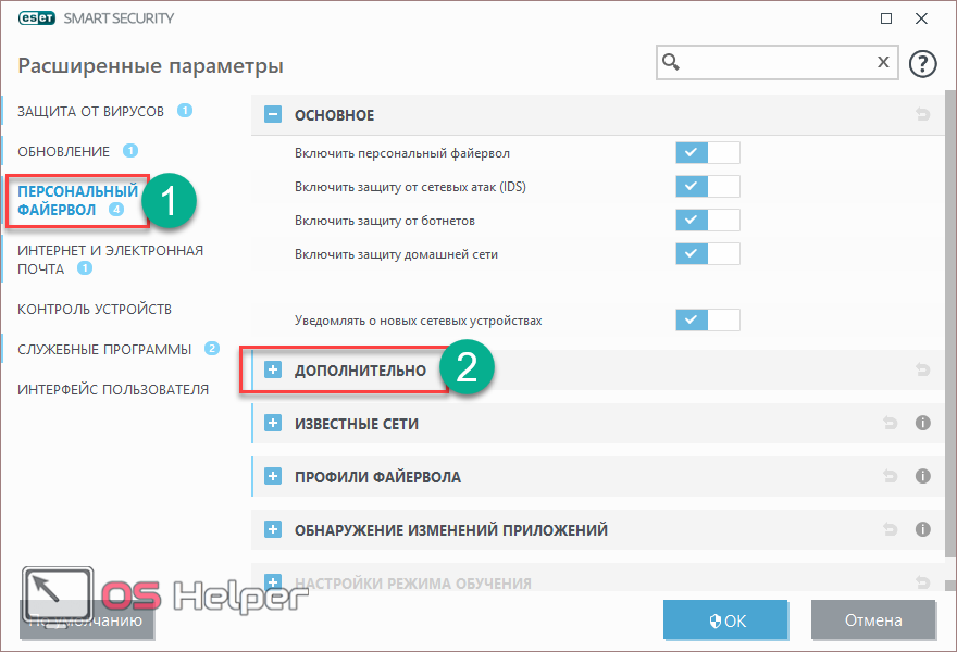 - Для запуска настроек нажмите на клавиатуре на кнопку F5. В открывшемся окне перейдите в раздел «Персональный файервол» и раскройте категорию «Дополнительно».