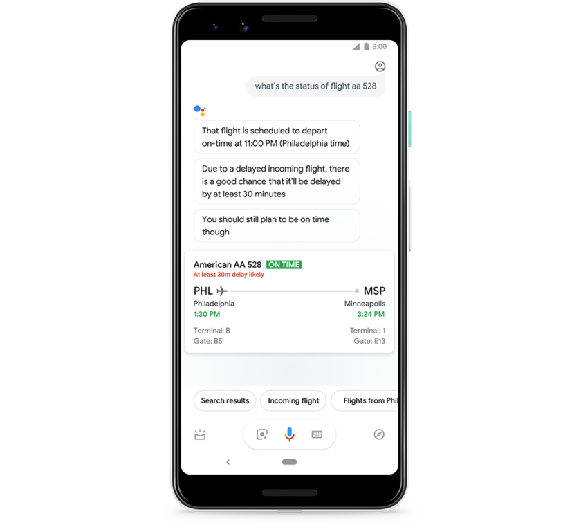 Для прогнозирования вероятных задержек авиарейсов голосовой помощник Google использует технологию машинного обучения и данные, полученные от запрашиваемой авиакомпании и из других источников. Сервис также сообщает о причинах отложенного полета. Кроме того, утверждается, что уведомления об отложенных перелетах будут приходить пользователям раньше официальных заявлений авиаперевозчиков.