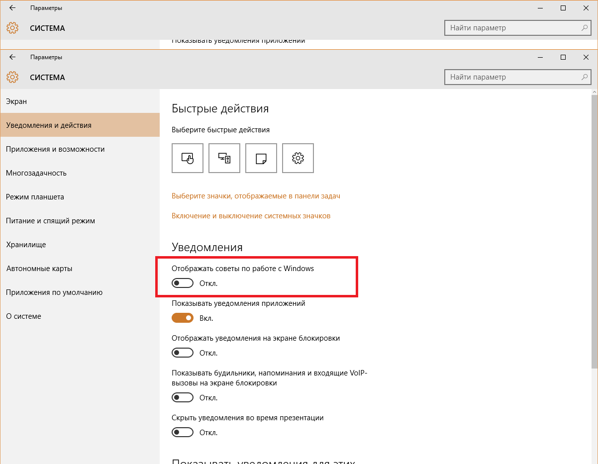 Пуск –> Параметры –> Система –> Отображать советы по работе с Windows –> отключить
