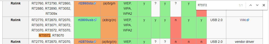 Находим, что в ней установлен чипсет Ralink RT5572. Ищем в таблице «RT5572»: