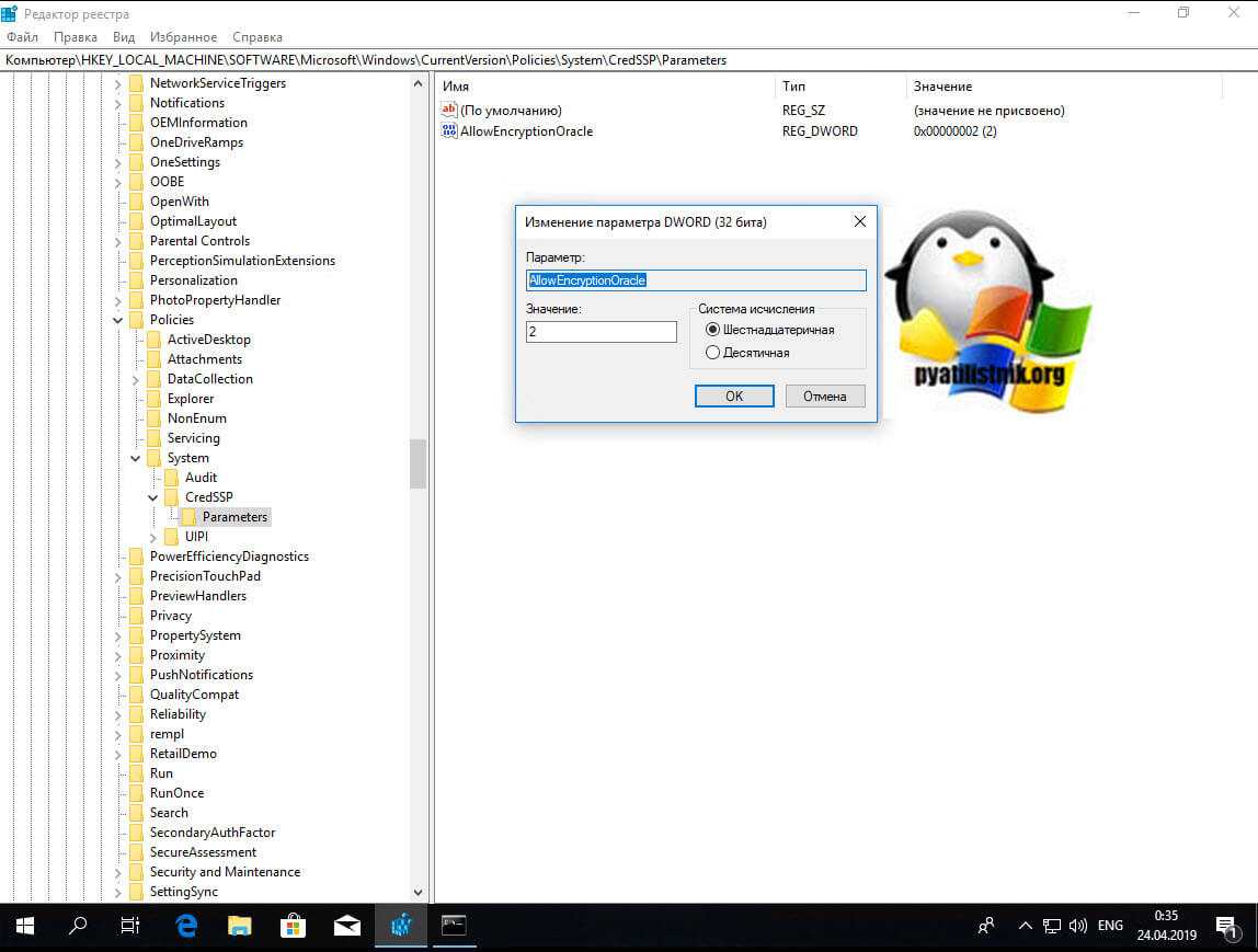 Тут вам необходимо создать REG_DWORD ключ с именем AllowEncryptionOracle и значением 2. В данном варианте политика CredSSP выставит Уязвимый уровень — это самый низкий уровень защиты. Это позволит вам подключаться к серверам удаленно, используя RDP. Однако это подвергнет серверы атакам.