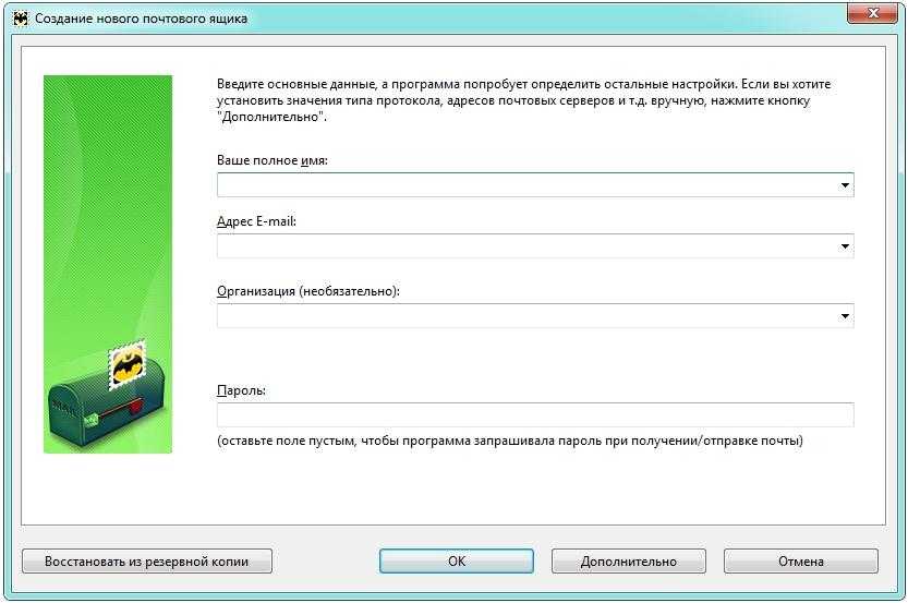 После установки запустите программу. Появится окно создания нового почтового ящика.