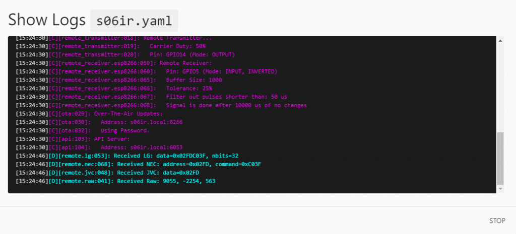 Чтобы добавить, например, кнопки телевизора, можно воспользоваться обучением. Для этого подносим пульт к приемнику и жмем на нужную кнопку. И смотрим лог esphome