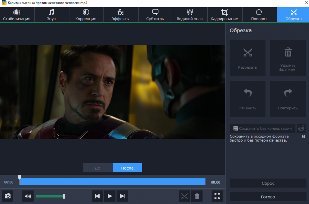 По умолчанию выбран режим — «Прямое потоковое вырезание (без перекодирования)». В этом случае произойдет быстрое вырезание видео файла без потери качества, и в итоге получаем файл точно такого же формата.