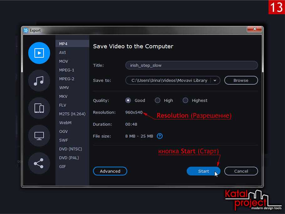 После выбора настроек, выберите место для сохранения видеоролика, дайте имя файлу, а затем нажмите на кнопку «Старт».