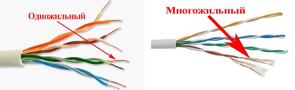 Еще есть витая пара многожильная и одножильная. Одножильные провода хуже гнутся, но имеет лучшие характеристики (сигнал можно предавать на большие расстояния) и лучше переносят обжим. Их используют при подключении интернет-розеток. В этом случае кабель фиксируется при монтаже и затем почти не изгибается.