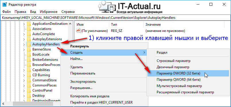 - Перейдите по адресу Компьютер\HKEY_CURRENT_USER\Software\Microsoft\Windows\CurrentVersion\Explorer\AutoplayHandlers. Чтобы не блуждать по джунглям реестра, просто скопируйте путь и вставьте его в адресную строку редактора, которая находится под меню.