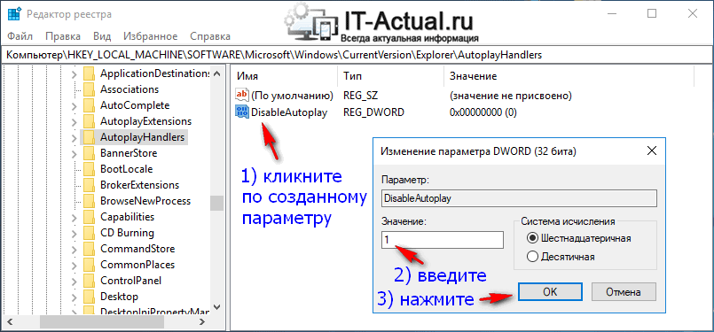 - Дважды кликните на параметр DisableAutoplay и установите значение 1.