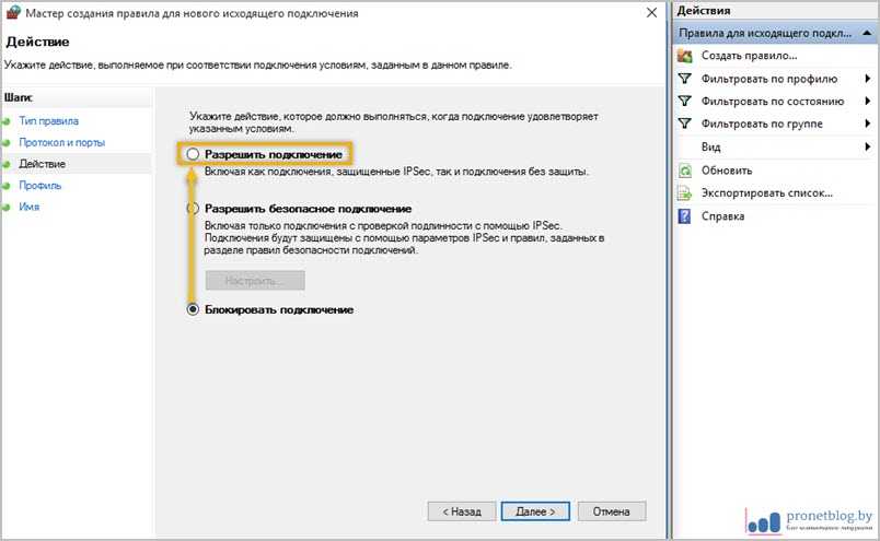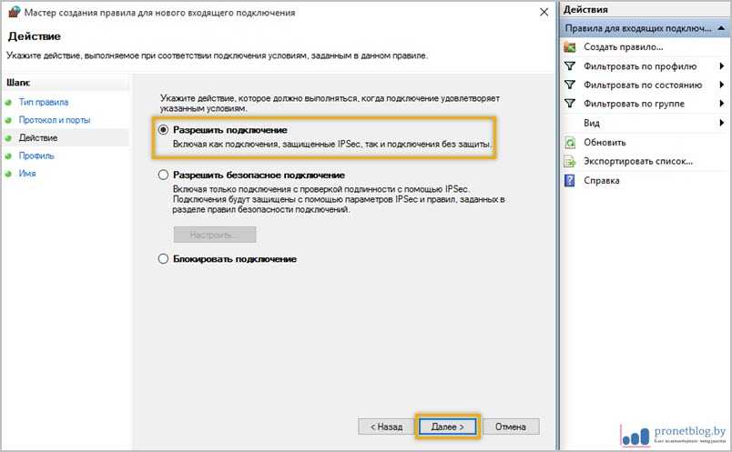 Только будьте очень внимательными при настройке выбора действия. Почему-то изначально брандмауэр предлагает “Блокировать подключение”. Это нам не нужно, поэтому ставим галочку напротив пункта “Разрешить подключение”.