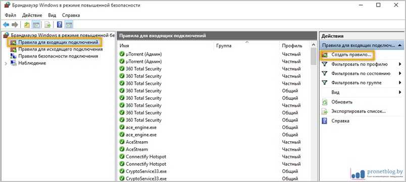 - Откроется окно «Брандмауэр windows в режиме повышенной безопасности», где слева нужно выбрать «Правила для входящих подключений», а вверху с права нажать на «Создать правило».