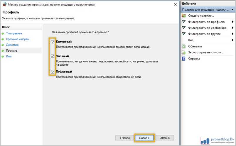 - В окне «Профиль» можно оставить все галочки. Жмём «Далее».