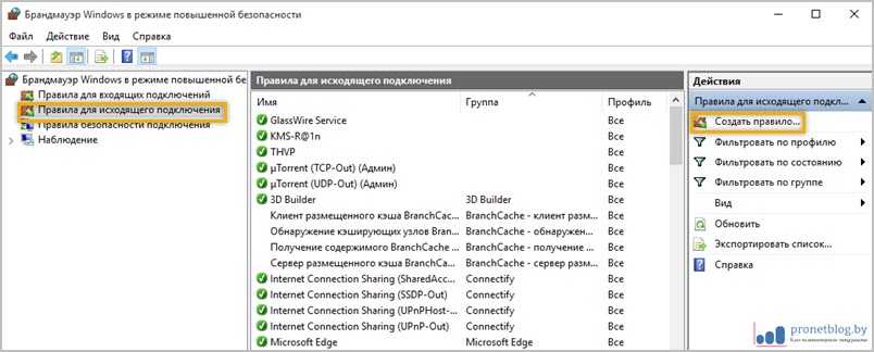 - Далее возвращаемся на главную страницу и выбираем вариант«Правила для исходящего подключения» и опять нажимаем «Создать правило». Создаем его таким же образом, как было описано ранее, для входящих подключений.