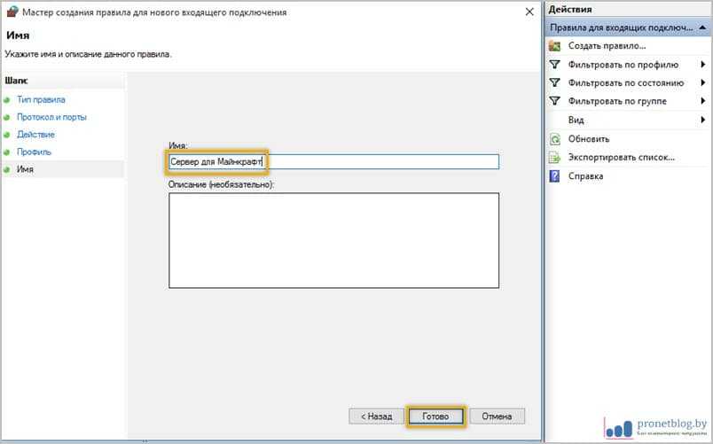 - Введите имя правила и описание. Для создания нажмите «Готово». То же самое необходимо проделать с протоколом UDP.