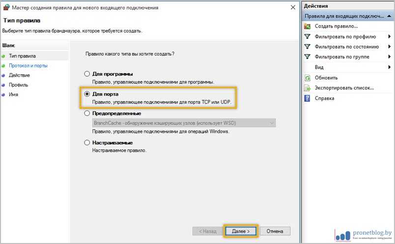 в правом меню расположена кнопка «Создать правило» ? откроется окно мастера создания правил «Для порта».