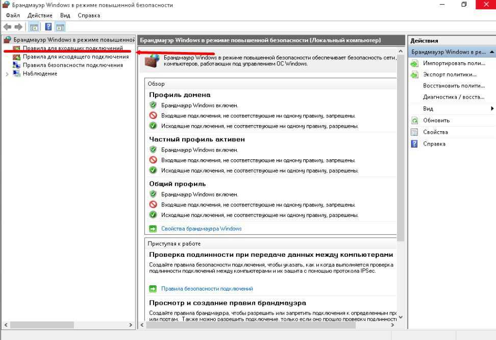 Начнем настройки со встроенного брандмауэра Windows 10. Для разрешения доступа к порту необходимо создать правила для входящего и исходящего соединения. Сделать это можно следующим образом: