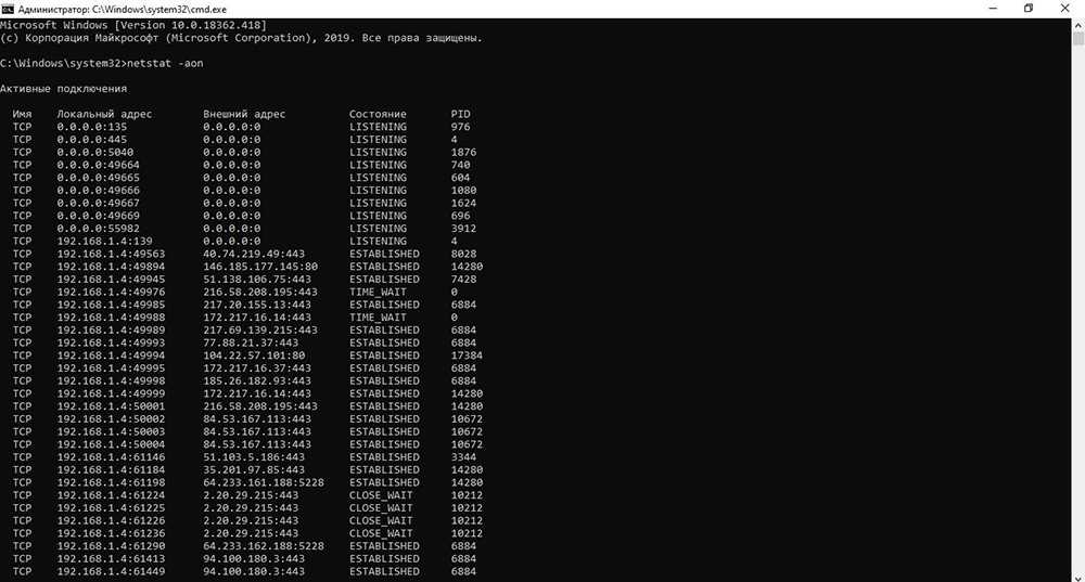 - В командную строку добавить netstat -aon, нажать Enter, чтобы выполнить ее.