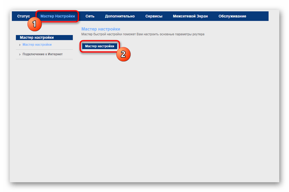Вкратце затронем тему быстрого конфигурирования сети, поскольку присутствующий в настройках Мастер точно пригодится начинающим пользователям и тем, кто не заинтересован в ручном изменении параметров, совершая их поиск в веб-интерфейсе. Для запуска быстрого конфигурирования откройте раздел «Мастер настройки» и запустите его, кликнув по специально отведенной для этого кнопке.