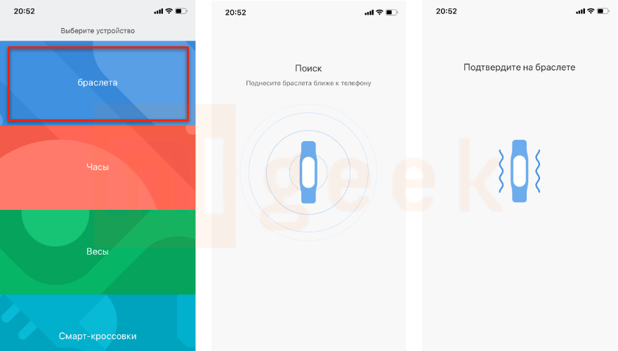 Выбираем «Браслет». Даем разрешение на все всплывающие вопросы и телефон переходит в режим поиска устройства.