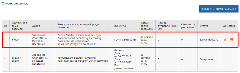 На открывшейся странице отображается список завершённых SMS-рассылок, при желании Вы можете добавить новую рассылку, для этого нажмите на кнопку: