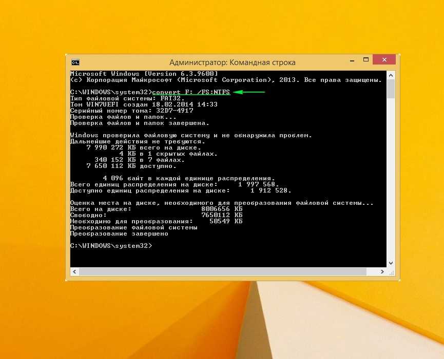В открытую командную строку нужно вписать следующий запрос: convert F: /FS:NTFS. На месте «F:» нужно вписать метку тома съемного диска, которая была запомнена ранее.