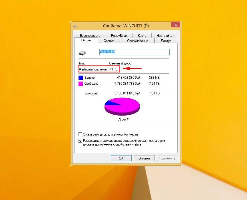 Тип используемой ФС можно найти в свойствах флешки на вкладке «Общие». На скриншоте информационная строка подсвечена зеленым маркером и указана стрелкой.