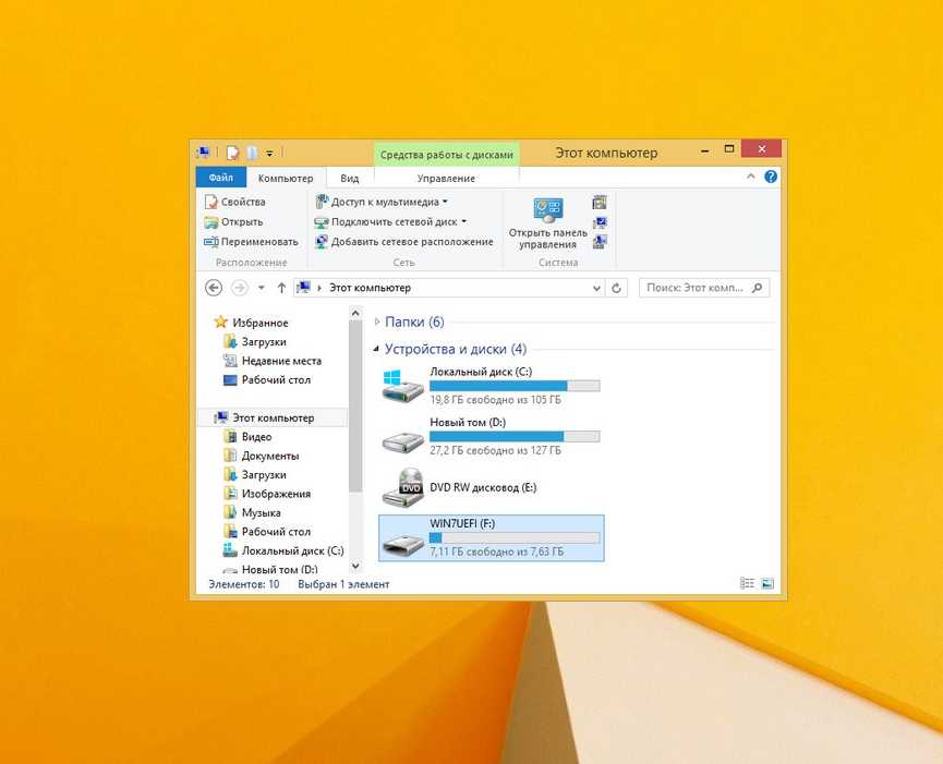 Итак, кликнем по ярлыку «Компьютер», войдём в проводник. Затем, выбираем раздел диска с нашей флешкой. У меня это диск F.