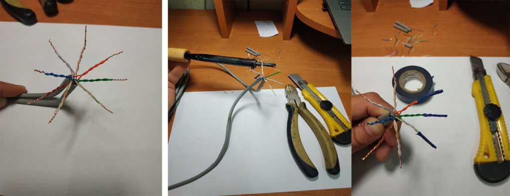 - Скрутивши все жилы по цвету, берем паяльник и начинаем пропаивать. Сложного в этом ничего нет, с этим справиться даже человек который первый раз берет паяльник в руки.