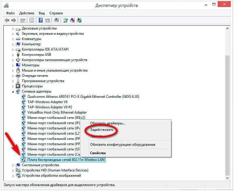 Нажмите сочетание клавиш Win+R и введите devmgmt.msc, чтобы открыть диспетчер устройств. Найдите и разверните графу «Сетевые адаптеры». В спсике будут все сетевые ваши адаптеры, включая виртуальные. Вам нужен беспроводной WiFi адаптер и он обозначается как Wireless или Wlan. Нажмите по нему правой кнопкой мыши и выполните по порядку: