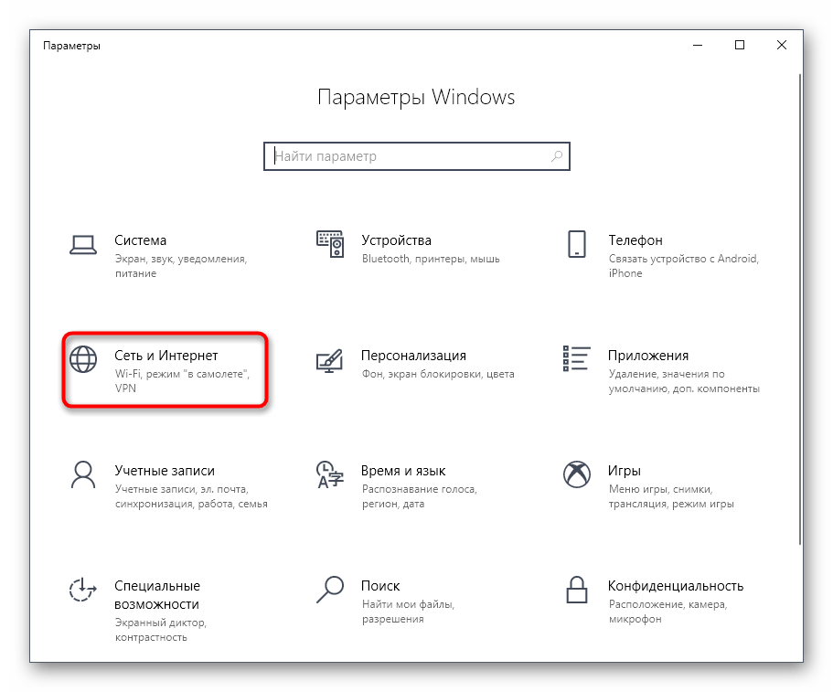 Заходите в окно «Параметры» или через «Пуск» – значок шестеренки, или с помощью комбинации клавиш Win+I. Затем переходите в раздел «Сеть и Интернет».