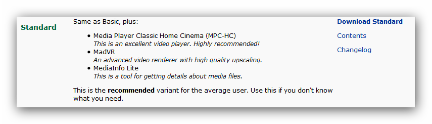 Standard – кодеки, проигрыватель Media Player Classic и утилита MediaInfo Lite;