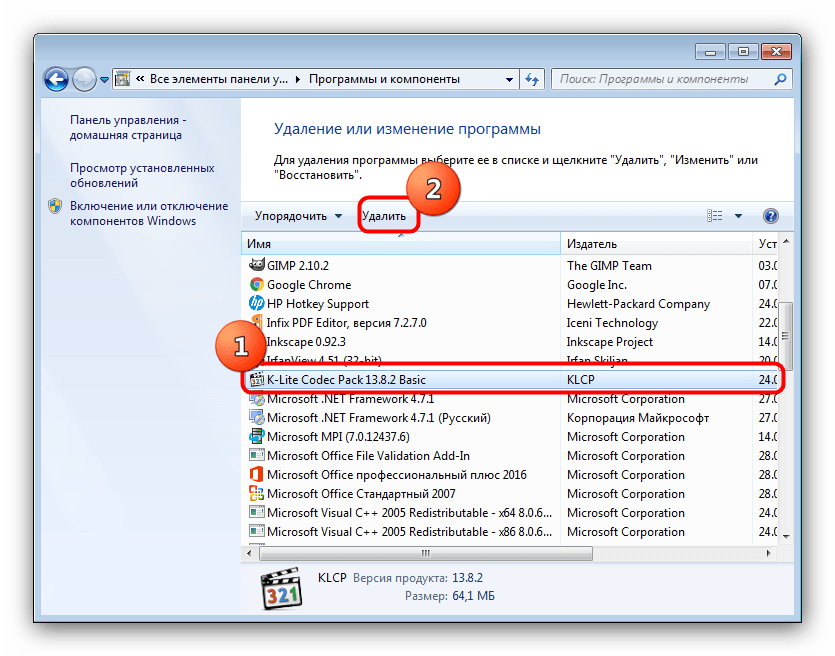 . Некоторые пакеты могут не иметь в имени этих слов, например, DivX, Matroska Pack Full, Windows Media Video 9 VCM, VobSub, VP6, Lazy Mans MKV, Windows Media Lite, CoreAVC, AVANTI, x264Gui.Выбираем программу в списке и нажимаем кнопку «Удалить»