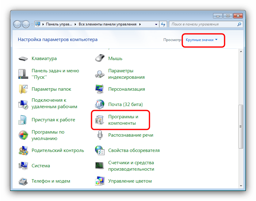 Переключите режим отображение крупных значков, после чего найдите пункт «Программы и компоненты».